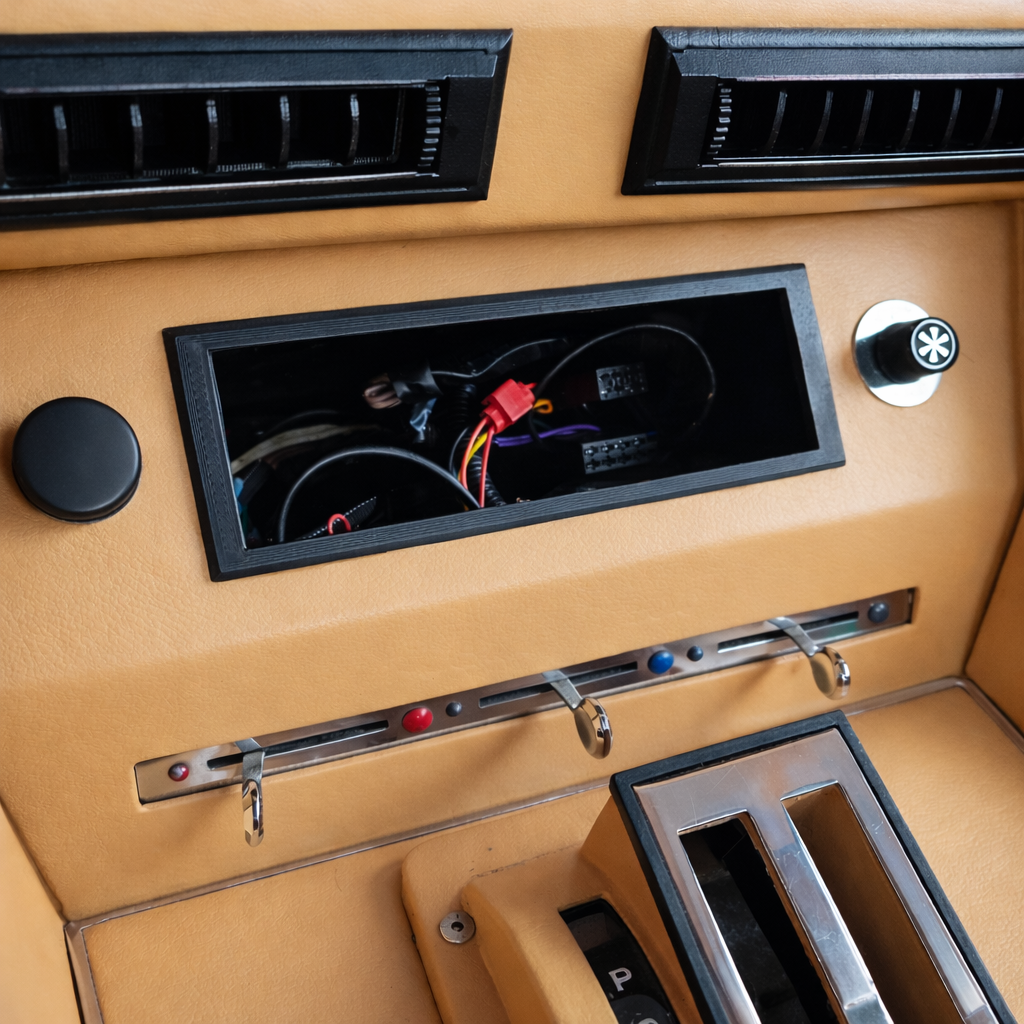 Radio bezel For Longchamp to properly fit your radio, 3d printed. The original opening is too wide for the later radio's (with a size of app 52 x 184 mm), which leaves an empty space. This bezel covers it.