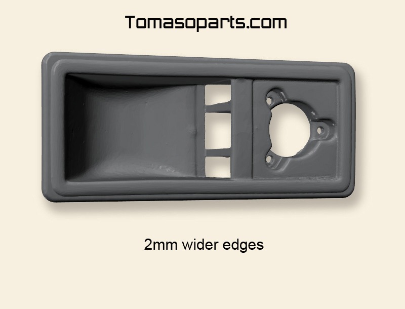 At the request of a customer, I have made a door handle tub with a 2 mm wider edge all around. This allows the tub to cover any imperfections in the paint around the opening in which it is mounted. Light rust, but also the overspray edge when the door was resprayed in the past without removing the handles (yes, it happens!).