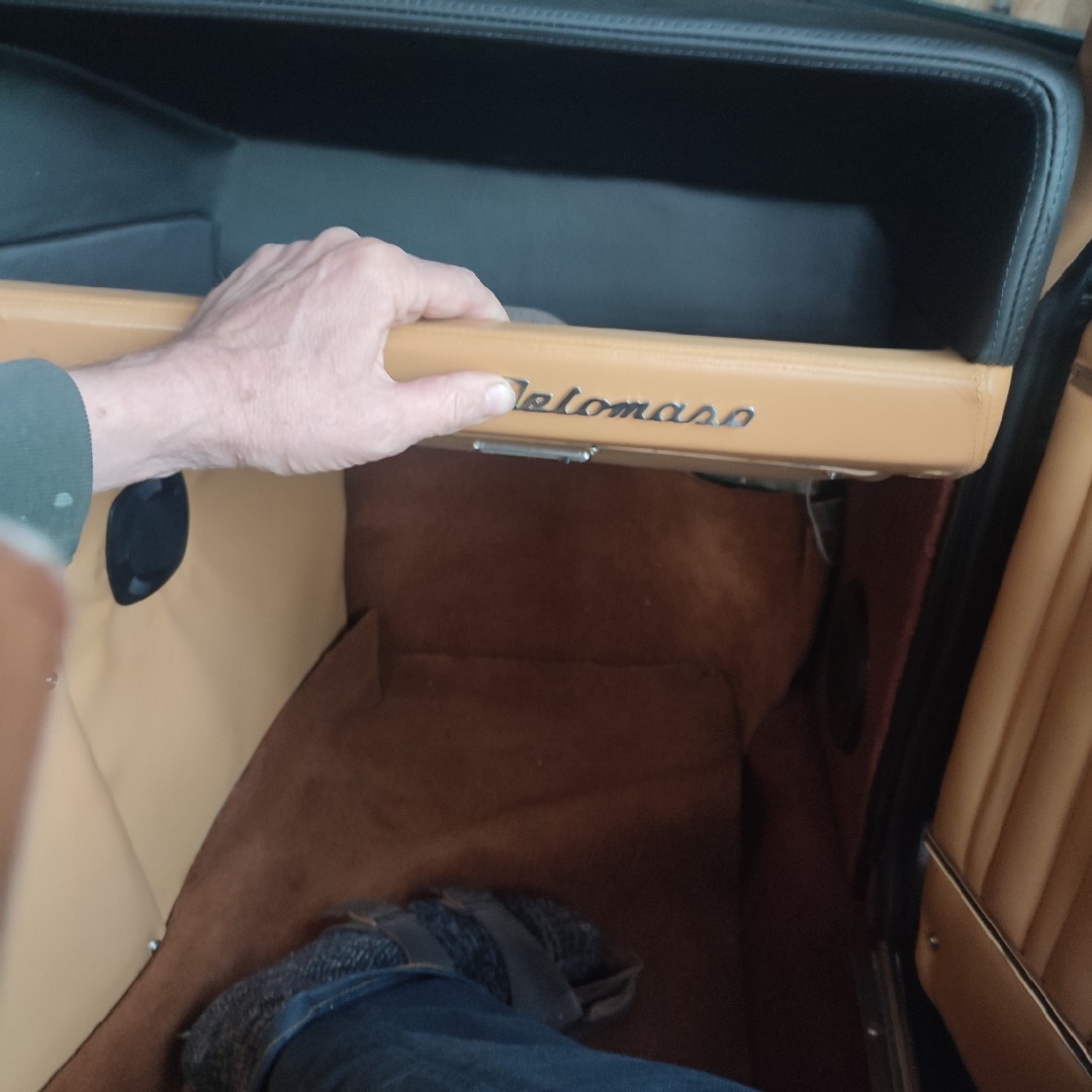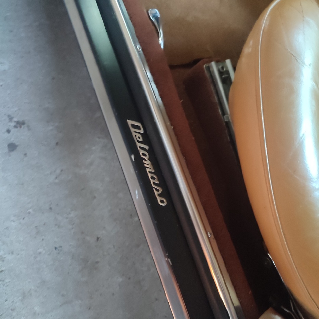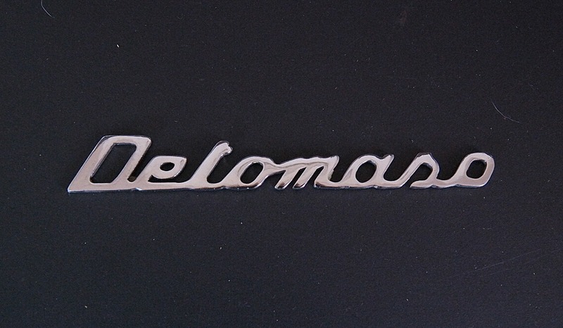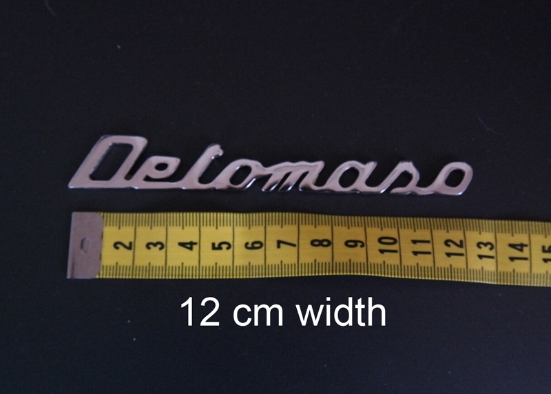 Small De Tomaso emblem (13 cm wide), polished stainless steel.