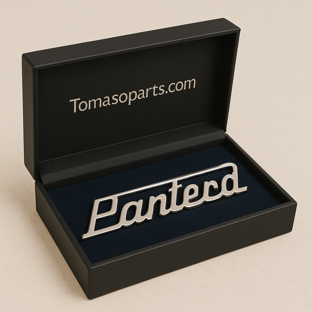 Pantera script with connection bar, 152 x 34 mm (6"x 1 3/8"), mirror polished stainless steel, glue on.